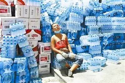 你睡在矿泉水“山”旁的那个照片,引起很多人关注。