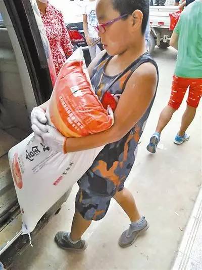 那天是我卸完70袋面之后,太阳晒得热,实在扛不住了,所以靠在水上睡着了。妈妈告诉我,网上有我的照片,很多人夸奖我,我挺开心的,虽然(救灾工作)挺累的,但我自己觉得值得。