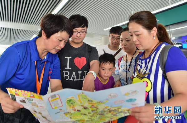 8月3日,厦门晨曦公益服务队队员刘鸿雁(左一)在厦门火车站出站口向游客介绍厦门主要旅游景点。