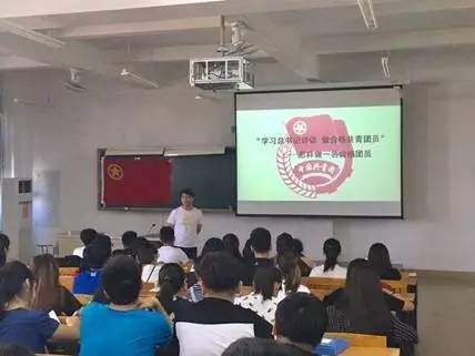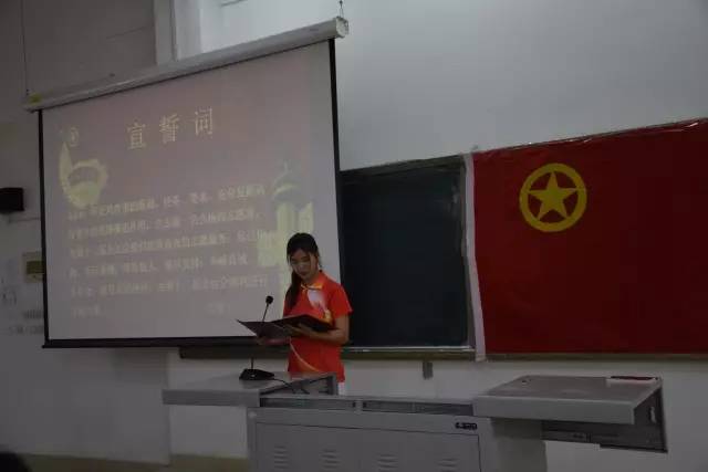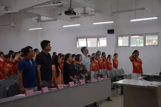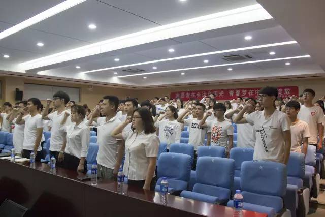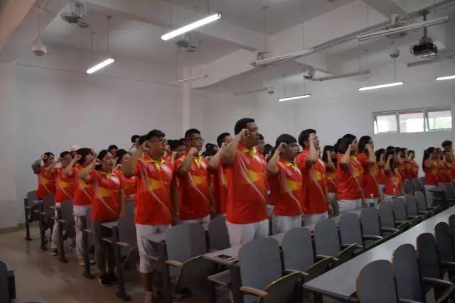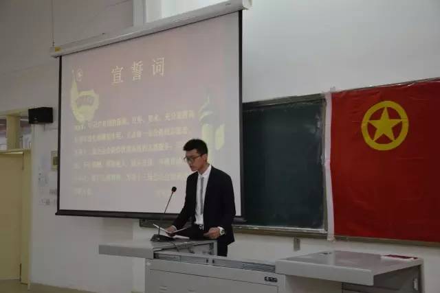 临时团支部书记吕琳代表全体团员进行发言,表达了今后志愿者们的工作安排和全体志愿者们不怕困难的决心与信心。最后,大会宣誓,我承诺,我牢记共青团的原则、任务、要求。充分发挥高校青年的先锋模范作用,我志愿做一名合格的志愿者。为第十三届全运会提供优质高效的志愿服务。尽己所能,不计报酬,帮助他人,服从安排,奉献真诚,服务社会践行志愿精神,传播先进文化,为第十三届全运会顺利进行贡献力量。大家整齐划一而又庄严的的誓词表达了他们的对全运会的激情。黑板上,高高挂起的团旗不仅证明了志愿者们的话语,也见证了他们的决心。