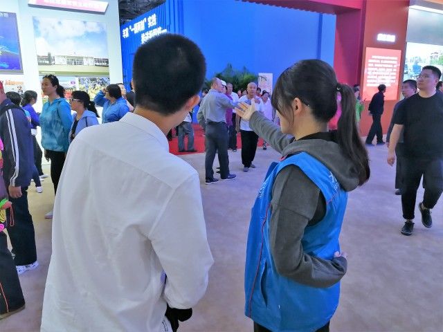9月26日是成就展面向公众开放的第一天,我院30名志愿者参加了首日的服务活动。志愿者分布在门票入口、序厅和各个展区,服务内容包括展区现场引导、翻译讲解、发放宣传册及信息咨询等四项工作。