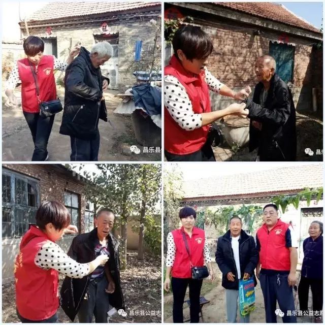 由共青团昌乐县委、昌乐县扶贫办联合昌乐县公益志愿者协会第二季“金晖助老”活动正式开始实施。 9月30日,志愿者们在协会办公室集合后,带着棉衣、大米等生活用品,按照前期实地走访的困难户、留守、孤寡、残疾等老人,将慰问品送到每户的家中,共计90户。每到一户,志愿者们便开始帮助老人打扫卫生,家用电器有故障的,由懂维修的帮其修理,并告知老人电器原理及日常维护,有的老人手机功能不会用的,懂电信的志愿者耐心的教导他们。志愿者们的无私奉献得到了受助老人们的一致赞扬,并高兴地与志愿者们合影留念。