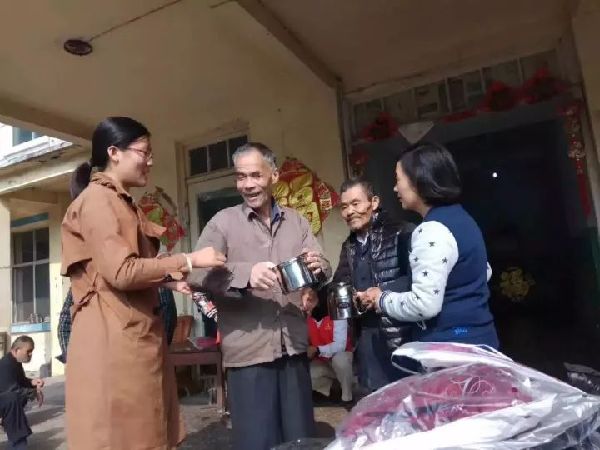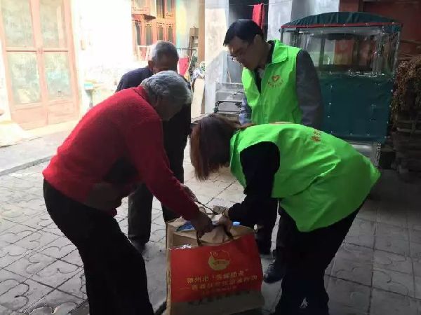 志愿者走进后湾等社区,为老人送去冬衣,发放结对卡。