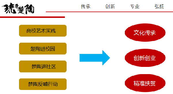 设立湖北大学楚陶艺术实践工作坊,聘请艺术学院专业老师指导,为大学生开设楚陶艺术鉴赏课程;开展产学研合作,创新楚陶制作工艺,制作精美楚陶销售,实现公益“造血”功能;对内在校内开展楚陶相关的创新创业教育实践,对外积极对外传播中国传统文化。