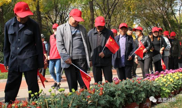 老人们头戴小红帽,手拿小国旗似一群郊游的孩子,用心品味着争奇斗艳的菊花。轻风吹来,一阵清香扑鼻,秋日暖阳映衬老人们欢笑的面庞。