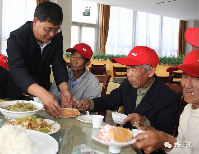 赏完菊花,按照行程安排,志愿者们陪同老人午餐、稍事休息。日照保安总公司食堂早早为老人们准备好了节日蛋糕和适合老人口味的饭菜。