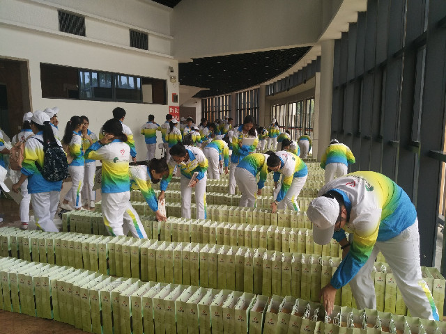 ▲图为志愿者正在准备大会物资