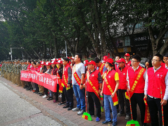 ▲图为400多名城市志愿者围绕洁净家园、文明交通服务客商大会