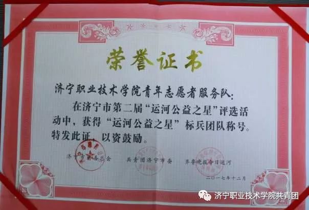 济宁职业技术学院青年志愿者服务队先后荣获山东省五四红旗团委a、山东省“雷锋号”先进集体、 山东省大中专学生志愿者暑期“三下乡”社会实践活动先进单位、优秀服务队,济宁市优秀志愿服务组织、济宁市红旗团委、济宁市关爱农民工子女志愿服务行动先进集体、第二十三届省运会志愿服务先进集体、第九届省残运会志愿服务先进集体、运河公益之星标兵团队 等荣誉