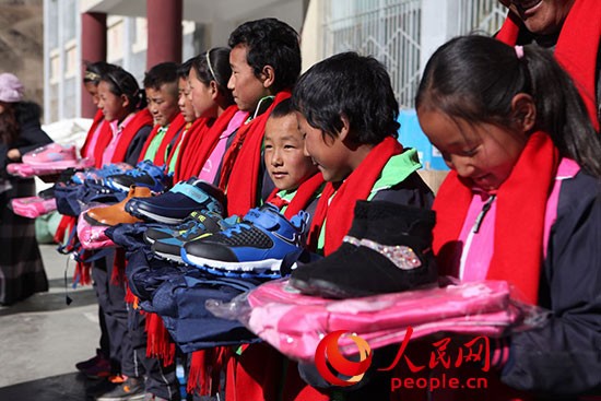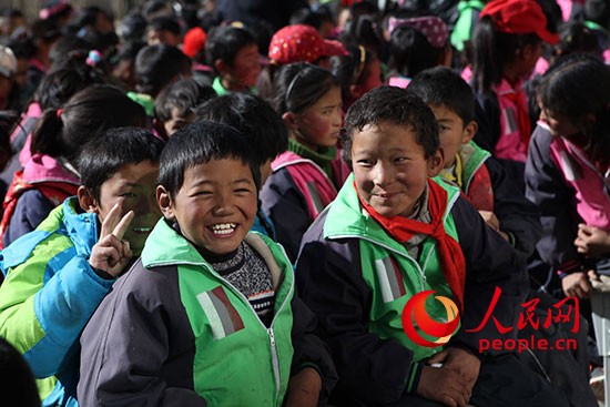 西藏日喀则萨迦县查两所偏远农村学校的孩子们开心地领取到了来自上海爱心人士和企业宝龙商业集团捐赠的物资。(人民网伍振国/摄)