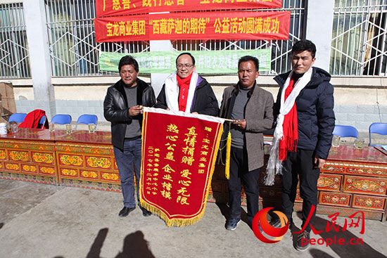 宝龙商业集团副总经理卢明(左二)代表企业接受校方赠送的锦旗。卢明因为高原反应身体出现严重不适,但他还是坚持前往捐赠学校亲手给孩子们送上爱心礼物。(人民网伍振国/摄)