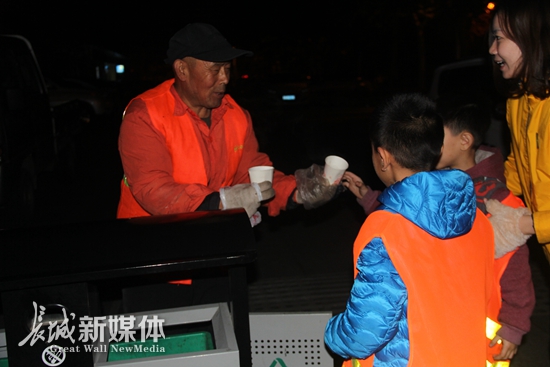 蚂蚁力量儿童义工团11月组织的给环卫工人送姜汤活动中小志愿者们积极参与。蚂蚁力量儿童义工团供图