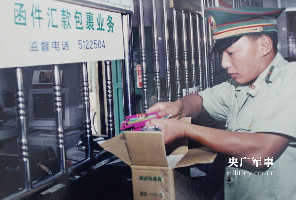 1997年,作为普通一兵的何方礼,把工资分成三份,其中一份寄给红瑶女童,图为他正在为女童邮寄学习用品。