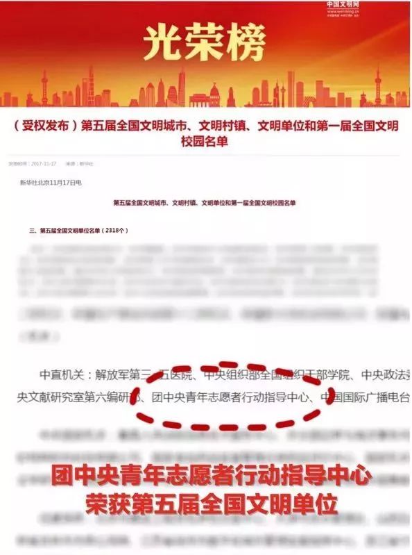 11月17日,团中央青年志愿者行动指导中心荣获第五届全国文明单位。