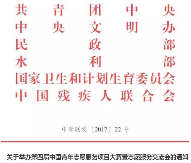 10月11日,共青团中央、中央文明办、民政部、水利部、国家卫生和计划生育委员会、中国残疾人联合会联合印发《关于举办第四届中国青年志愿服务项目大赛暨志愿服务交流会的通知》。