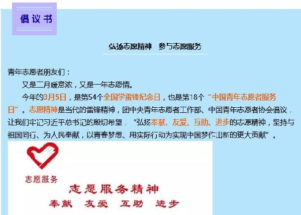 3月1日,团中央青年志愿者工作部、中国青年志愿者协会秘书处向全国青年志愿者发出“弘扬志愿精神参与志愿服务——全国学雷锋纪念日、中国青年志愿者服务日倡议书”。