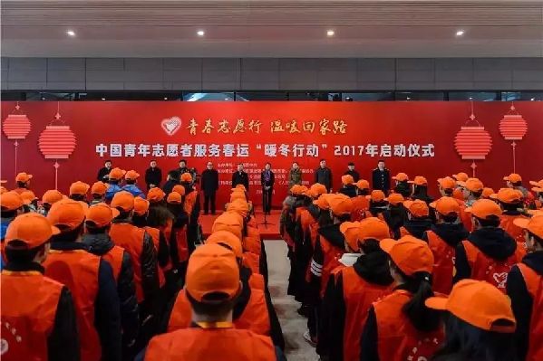 1月15日,2017年中国青年志愿者服务春运“暖冬行动”在上海虹桥火车站启动,东航“英雄机长”何超和上海交通“畅行联盟”的260多名春运青年志愿者,在启动仪式上宣誓。