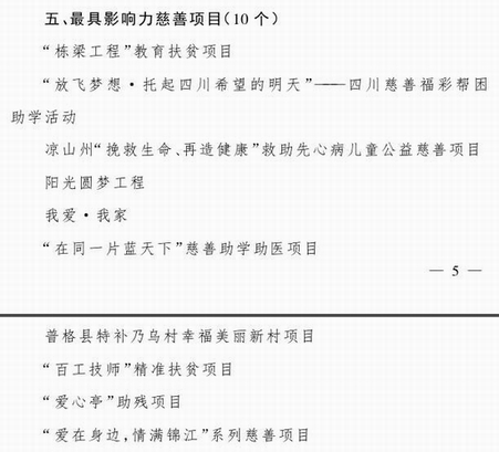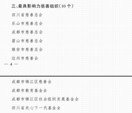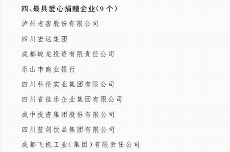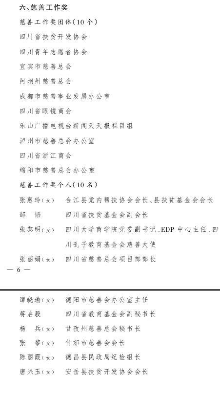 省政府决定,授予四川省扶贫基金会等9个(名)单位(个人)“最具爱心慈善楷模”称号,徐伯玉等16名个人“最具爱心慈善个人”称号,四川省慈善总会等10个慈善组织“最具影响力慈善组织”称号,泸州老窖股份有限公司等9个企业“最具爱心捐赠企业”称号,“栋梁工程”教育扶贫项目等10个项目“最具影响力慈善项目”称号,四川省扶贫开发协会等20个(名)单位(个人)“慈善工作奖”称号。