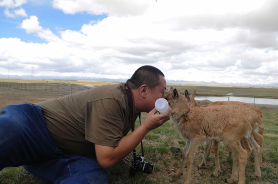 贺瑞明给保护站的小藏羚羊喂奶。采访对象供图