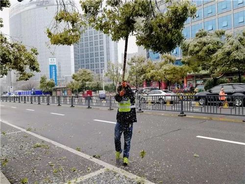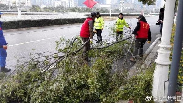 团市委紧急招募近60余名青年志愿者和蓝天、蓝豹救援队等青年社会组织组建青年突击队在红谷滩新区红谷中大道、丰和中大道、庐山南大道等主要交通要道开展除冰清扫志愿服务活动,对街道、社区被冰冻压断的树枝进行清理,保证行人出行安全。