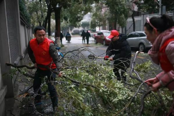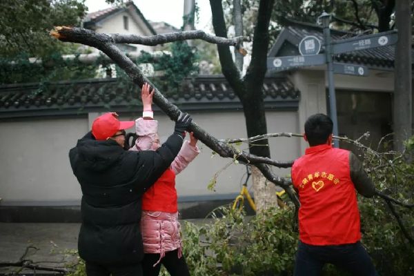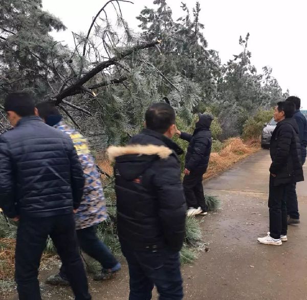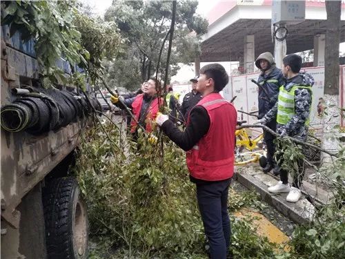 团进贤县委组织青年志愿者们开展冰雪天气防灾减灾工作,清运弯折树枝。