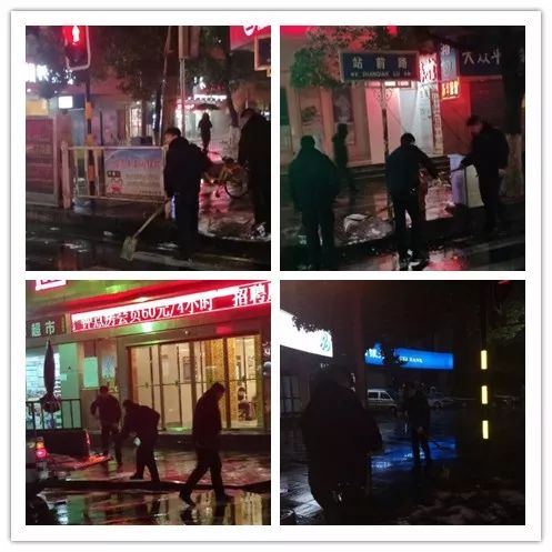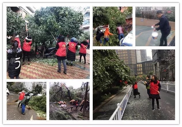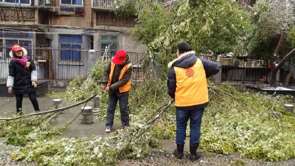 红谷滩新区的青年志愿者们积极配合各社区干部为结冰路面撒盐化冰、清理小区弯折树枝,并对小区环境进行清理。