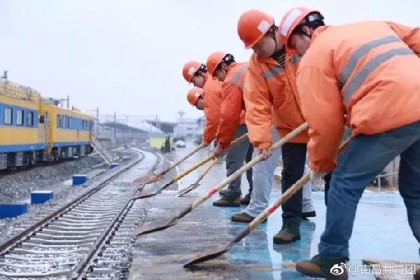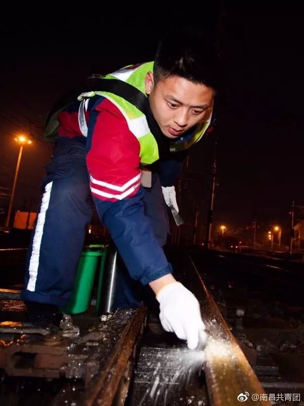 南昌轨道交通集团团员青年为保障地铁轨道道岔正常工作,每半小时确认一次道岔位置,判断是否冻住,一晚共检验道岔400次。如发现积雪结冰情况,将携带铲雪锹、除冰铲、工业盐、开水瓶、钢刷进行处理,每处理一组道岔,需要泼水撒盐、铲雪除冰共计20多分钟,期间还要一直处于弯腰状态。同时,青年文明号志愿者们分别在各轨道站点,开展除冰扫雪志愿服务活动,为路口撒盐除冰,铺设防滑草垫和麻袋。