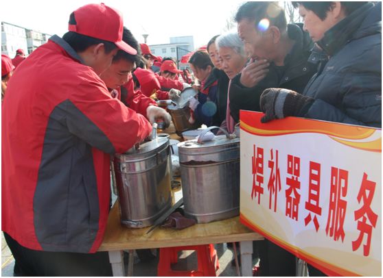 “志愿者,上次我孙子提水摔了一次之后,这个壶嘴就总是漏水,你帮大娘修修……”看这忙碌的场面,这是“焊补器具服务区”。鲍店矿维修小分队的志愿者,随身携带着早已准备好的焊锡、烙铁、挫刀等常用工具来到活动现场。谁家里的锅、碗、瓢、盆、茶水壶等只要有漏洞都可以拿过来免费修补,可别小看这缝缝补补,补完了不美观或者撑不了多久又漏水怎么办?为了能把技艺练好,鲍店矿维修小分队的成员私下可没少下功夫。