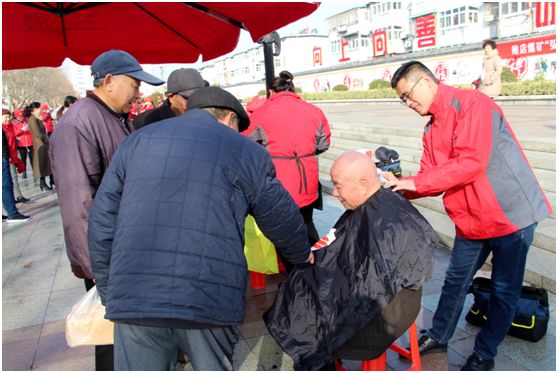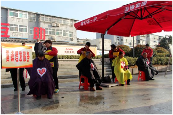 最后一个服务区的是“雷锋理发服务区”。大爷大妈们已早早的来排好队了。