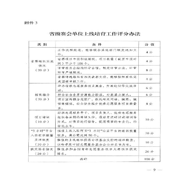 六、省级赛会单位上线培育工作评选根据《省级赛会单位上线培育工作评分办法》对各省级赛会的组织实施情况、招商推介、项目培训、“3小时”平台入驻组织数量及活跃度、获奖排名情况等方面进行综合排名。全国组委会联合阿里公益及中国志愿服务基金会共同开展评审工作,对排名前3名的赛会单位,各给予7万元支持资金;对排名第4名至第10名的赛会单位,各给予5万元支持资金。