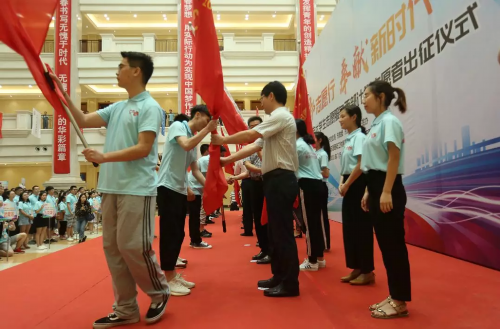 与会领导为即将赴岗的研究生支教团、基础教育、脱贫攻坚、生态环保、创新创业等12支志愿服务队授旗