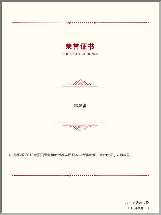 2018年8月5日至9日,“鲁阳杯”2018全国国际象棋新秀赛在沂源举行。为了更好地服务本次全国性的赛事,沂源团县委组织招募了志愿者20名。在此次赛事中,志愿者展现自我,服务本次比赛,全面的展现出了沂源人民的热情与风采。