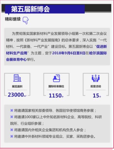 第五届新博会以“促进新材料生产应用”为主题,由工业和信息化部与黑龙江省人民政府共同主办,将于2018年9月6至8日在哈尔滨国际会展体育中心召开。