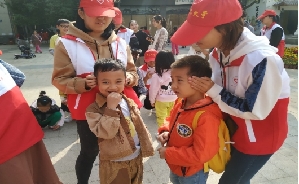 志愿者们还与小朋友们一起做游戏,小朋友们表现地十分兴奋。一双双圆溜溜的大眼睛看着奖品毫不掩饰地表达自己的喜爱,一双双小手举得高高的回答哥哥姐姐们的问题。他们回答着自己从插画书中看到的重阳节的历史与传说,对“老人节”的奇妙传说感到好奇。