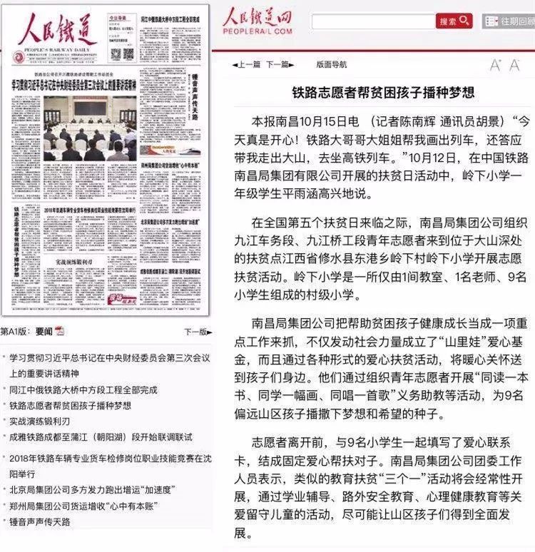 在全国第五个“扶贫日”来临之际,根据中国铁路南昌局集团有限公司2018年扶贫日活动部署 ,集团公司团委组织九江车务段、九江桥工段青年志愿者,来到江西省修水县东港乡岭下村的岭下小学,开展“三个一”爱心助教活动。