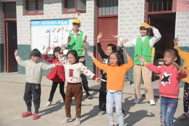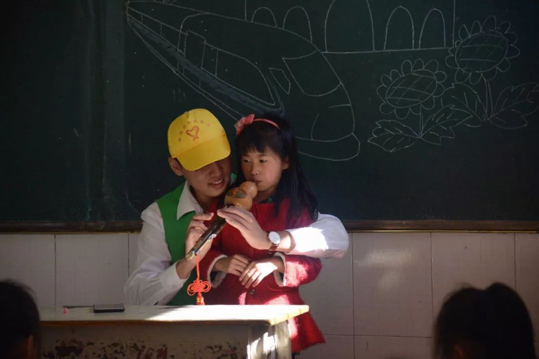 “同唱一首歌”环节里,志愿者拿出了乐器葫芦丝与小朋友们一起互动,邀请大家上台表演,手把手教大家吹奏乐器。在教室外的小操场,活泼可爱的小朋友们与志愿者们一起边唱边跳、手舞足蹈。