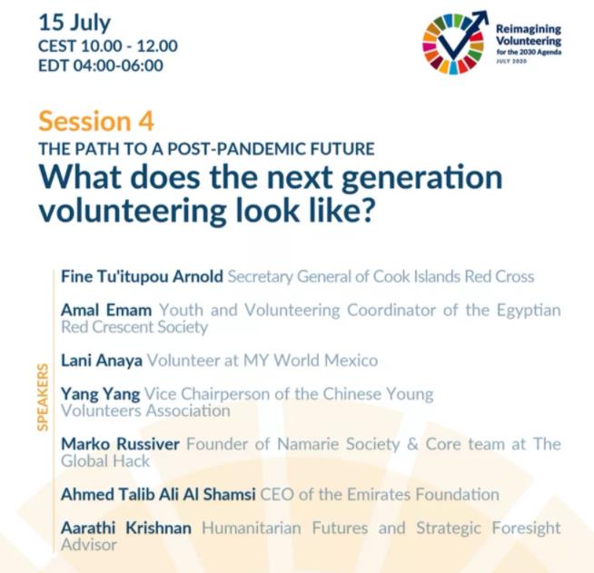 此次会议是联合国可持续发展高级别政治论坛(HLPF)期间的一项特别活动,由联合国志愿人员组织(UNV)和红十字会与红新月会国际联合会(IFRC)共同主办,也是疫情期间联合国首次借助网络平台召开的线上全球技术会议。本次会议汇集了来自世界不同地区与领域的志愿服务组织代表和志愿者,对下一代志愿服务发展作了深入探讨。