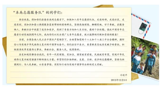 2013年12月5日,习近平总书记给华中农业大学“本禹志愿服务队”回信,勉励同学们“以青春梦想、用实际行动为实现中国梦作出新的更大贡献”。总书记的重要回信始终是“本禹志愿服务队”师生们的自觉坚守和行动指南。