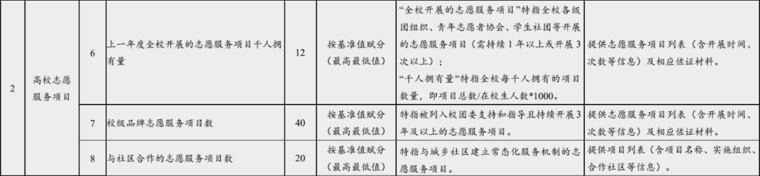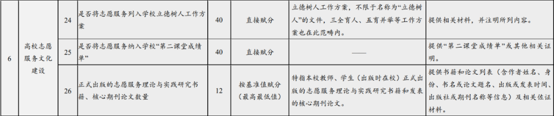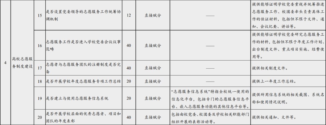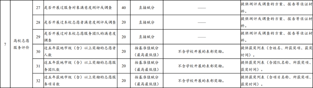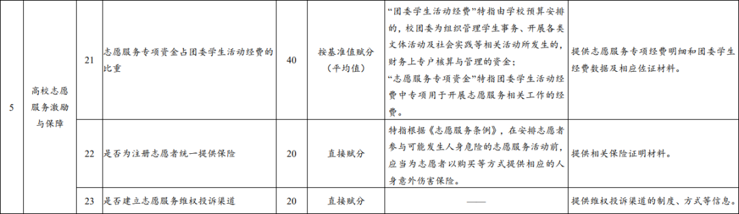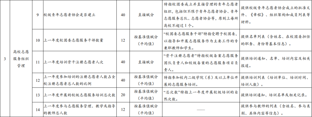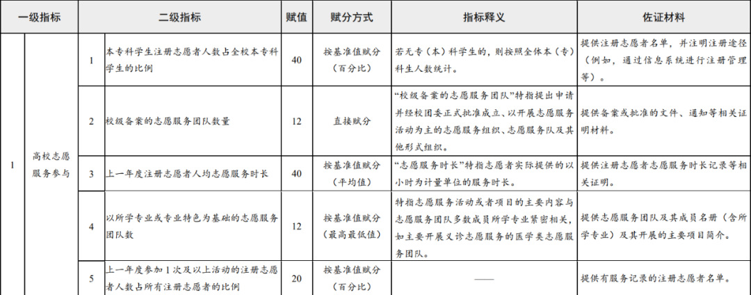 《高校志愿服务指标体系(试行)》综合考虑了不同地域、不同类型、不同规模高校的特点,共包括7个一级指标,32个二级指标;二级指标中,核心指标13个,重要指标12个,基础指标7个。指标体系架构、指标释义、赋分方式及佐证材料见下表。自行开展中长期指标观测的高校,可根据实际设定相关指标的基准值。