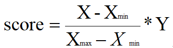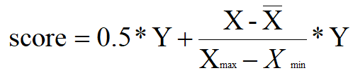 其中,Y表示该项总分,X为高校该项的实际数值,图片为所有高校该项的最高值,图片为所有高校该项的最低值,图片为所有高校该项的均值。如所得分数出现负值,则直接计为0分。